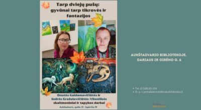 Spalio 21 d.–lapkričio 19 d. / Aukštadvario biblioteka Skaitmeninių ir tapybos darbų paroda „Tarp dviejų pušų: gyvūnai tarp tikrovės ir fantazijos“ Parodoje eksponuojama Indrės Gražulevičiūtės-Vileniškės tapyba ir Onutės Gaidamavičiūtės darbai, sukurti naudojant dirbtinį intelektą. Kūriniuose vaizduojami tikri ir mitologiniai gyvūnai. Abi parodos autorės yra menotyrininkės, menininkės, kurios domisi dirbtinio intelekto galimybėmis ir eksperimentuoja, kurdamos mišrios autorystės darbus. |
