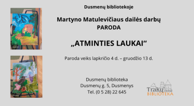 Lapkričio 4 d. – gruodžio 13 d. / Dusmenų biblioteka Dailės darbų paroda „Atminties laukai“ Parodoje eksponuojami Martyno Matulevičiaus dailės darbai, sukurti įvairia tematika. Daugumoje jų matoma gamta, gyvūnai ir net žinomi objektai ar personažai. |