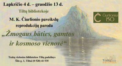 Lapkričio 4 d. – gruodžio 13 d. / Tiltų biblioteka M. K. Čiurlionio paveikslų reprodukcijų paroda „Žmogaus būties, gamtos ir kosmoso vienovė“ Parodoje eksponuojamos M. K. Čiurlionio paveikslų reprodukcijos, taip pat knygos, straipsniai, informacinė medžiaga apie žymų dailininką ir kompozitorių. Paroda skirta Mikalojaus Konstantino Čiurlionio metams paminėti. |