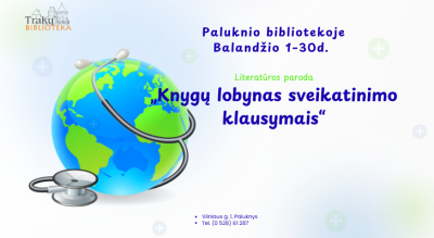 Balandžio 1–30 d. / Paluknio biblioteka Literatūros paroda „Knygų lobynas sveikatinimo klausimais“ Paroda kviečia susipažinti su įvairiais leidiniais apie žmogaus fizinę ir emocinę sveikatą, sveiką gyvenseną bei savijautos gerinimą. Skirta Pasaulinei sveikatos dienai.